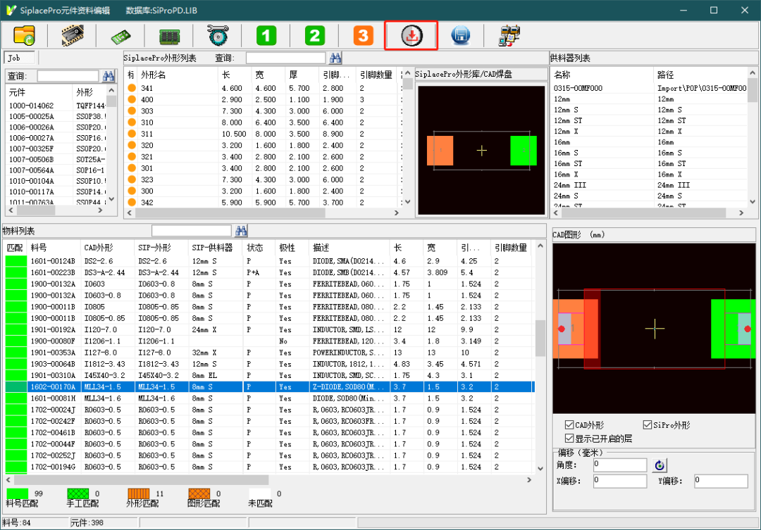 貼片編程中在元件資料編輯界面完成1、2步驟操作后,接下來選擇“系統庫獲取”功能圖標,軟件會從系統庫匹配并下載特殊器件的的角度補償。這樣就完成角度補償設置了。