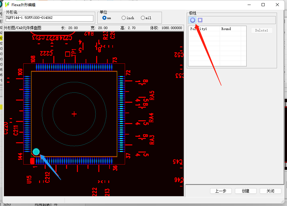 6. 點擊應用隨后就會出現我們的PD庫制作界面,可以選擇輸入的數值單位,調整外形角度的地方可以定義元件的初始角度,這里由于一般IC的0度定義在左下角,因此點擊旋轉,將極性點旋轉到左下角,屬性定義封裝角度為0度。
