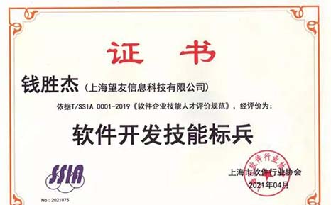 4月29日望友科技收到來自上海市軟件行業(yè)協(xié)會授予的“軟件開發(fā)技術(shù)標(biāo)兵”證書,該證書是協(xié)會授予望友科技研發(fā)部門主管錢勝杰的。